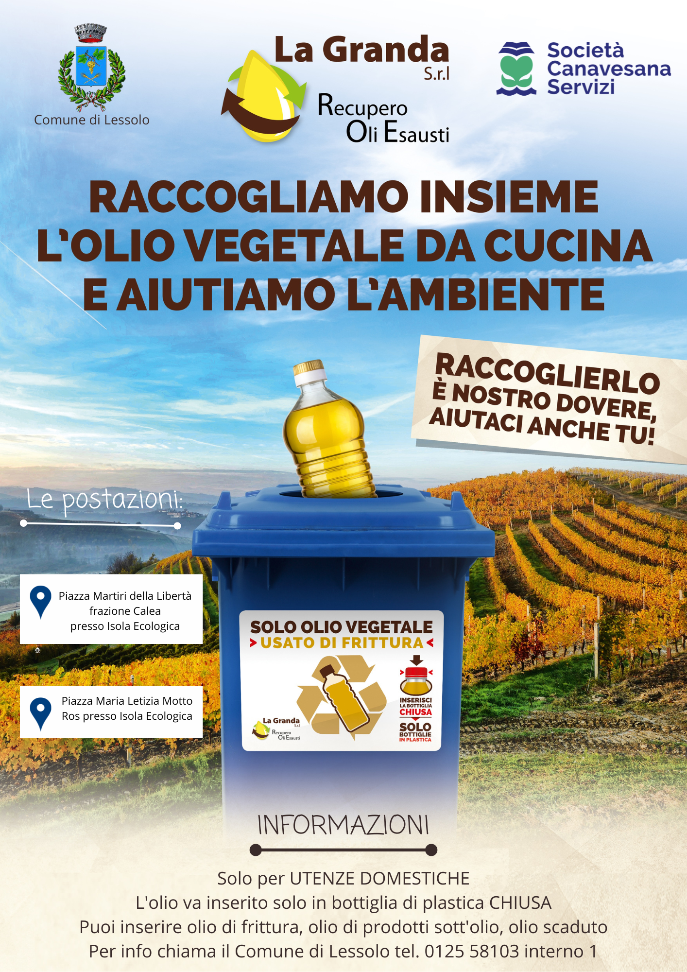 L’Amministrazione Comunale ha aderito alla proposta della Società Canavesana Servizi S.p.A. per l'attivazione di un servizio di raccolta di oli vegetali esausti, dedicato alle utenze domestiche di Lessolo.