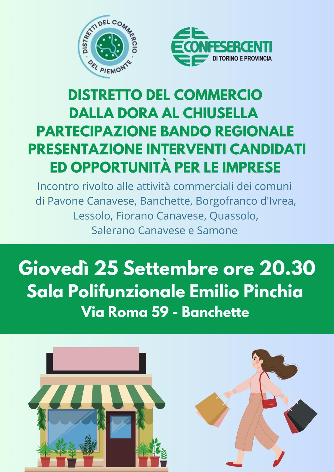 A seguito della riunione dei Sindaci del Distretto Diffuso del Commercio “Dalla Dora al Chiusella”, è stato organizzato un incontro con i commercianti presso la Sala Polifunzionale Emilio Pinchia a Banchette, per illustrare le opportunità di partecipazione al secondo bando della Regione Piemonte “Progetti Strategici dei Distretti del Commercio del Piemonte – Triennio 2025–2027”.