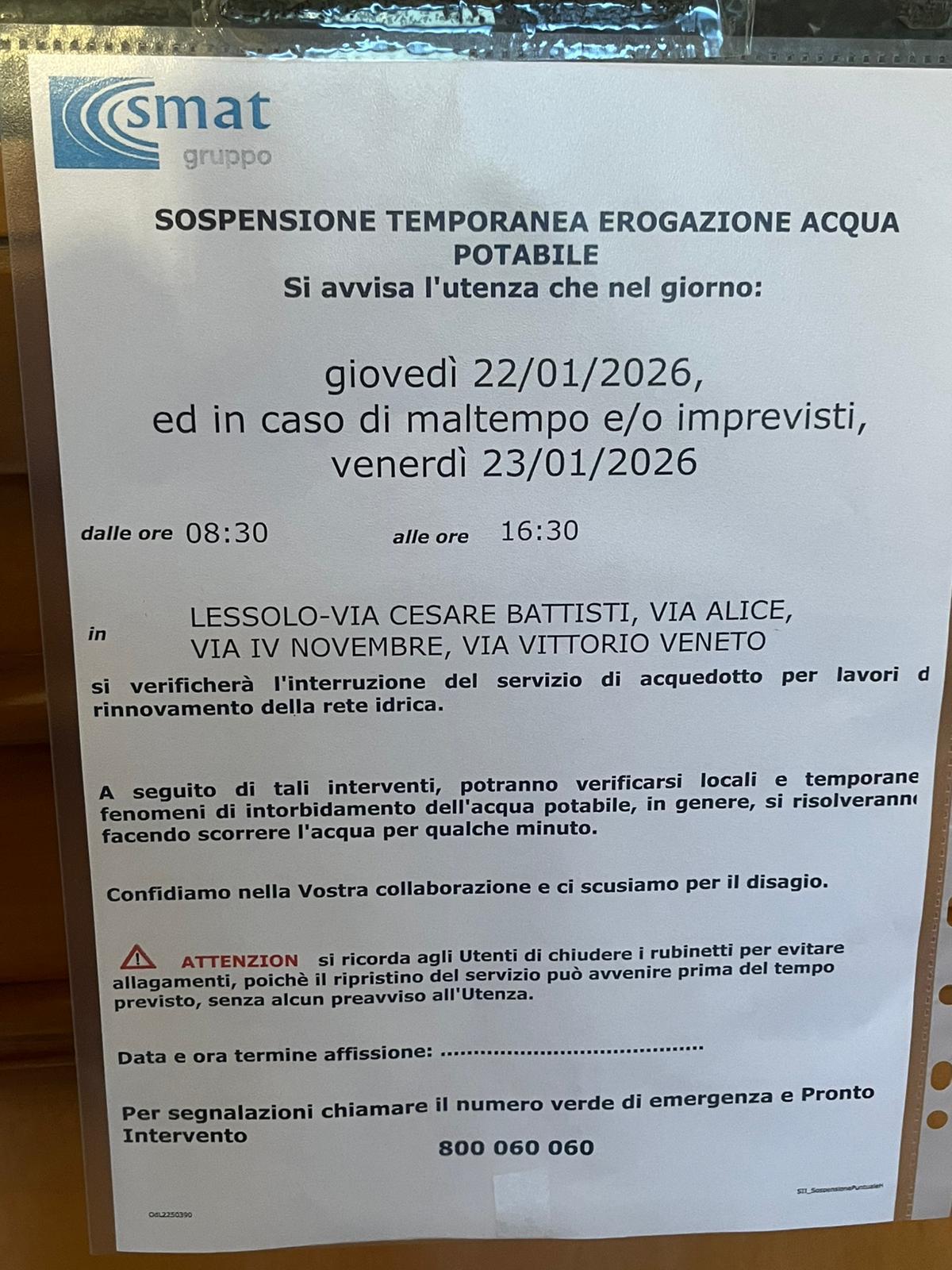 Si avvisa che il giorno 22/01/2026 e/o in caso di maltempo il giorno 23/01/2026 dalle ore 8:30 alle 16:30 in Via Cesare Battisti, Via Alice, Via IV Novembre e Via Vittorio Veneto sarà sospesa l'erogazione dell'acqua potabile nelle ore indicate per lavori di rinnovamento idrico.