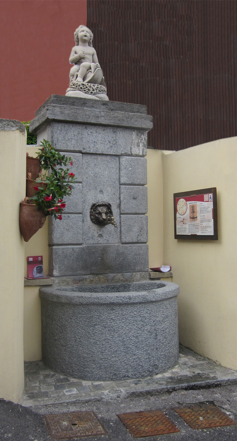 La fontana S.Rocco è situata sul sistema di condotta d’acqua del progetto di Giovanni Ferrando. L’attuale struttura a colonna deriva da una modifica del progetto del 1861 e pertanto risulta differente dal disegno di Ferrando del 1860. Nel 1865-66 sulla sommità venne collocata una statua in pietra raffigurante un Putto sul Delfino la cui esecuzione fu affidata alla stessa scuola viggiutese di Giuseppe Argenti, scultore delle statue del Duomo di Ivrea. La vasca originale è andata perduta. Quella attuale, costruita nel 2015 per la creazione della passeggiata, sostituisce la fontanella in ghisa ivi posizionata intorno al 1940