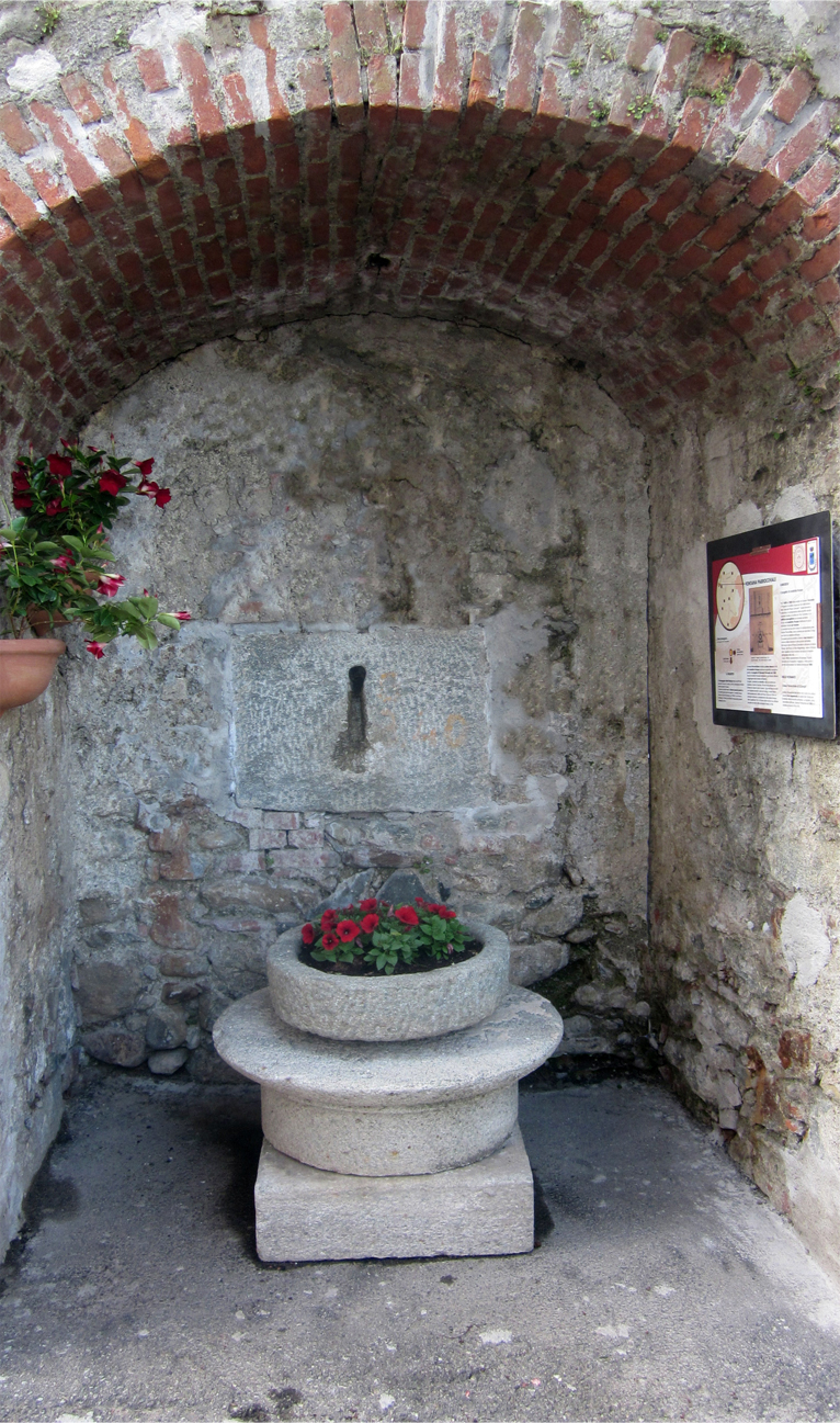Tale progetto prevedeva una nicchia, nella cui muratura era inglobato un catino di raccolta. All’interno era collocata una fontana in pietra. Oggi resta solo la nicchia con l’originale pannello in pietra del catino. La vasca venne infatti spostata sotto l’edificio del Pozzo Sonza nel 1894 e lo schienale ricollocato a completamento dell’odierna fontana della Cappella nel 1914 e lo schienale ricollocato a completamento della odierna fontana della Cappella nel 1914.